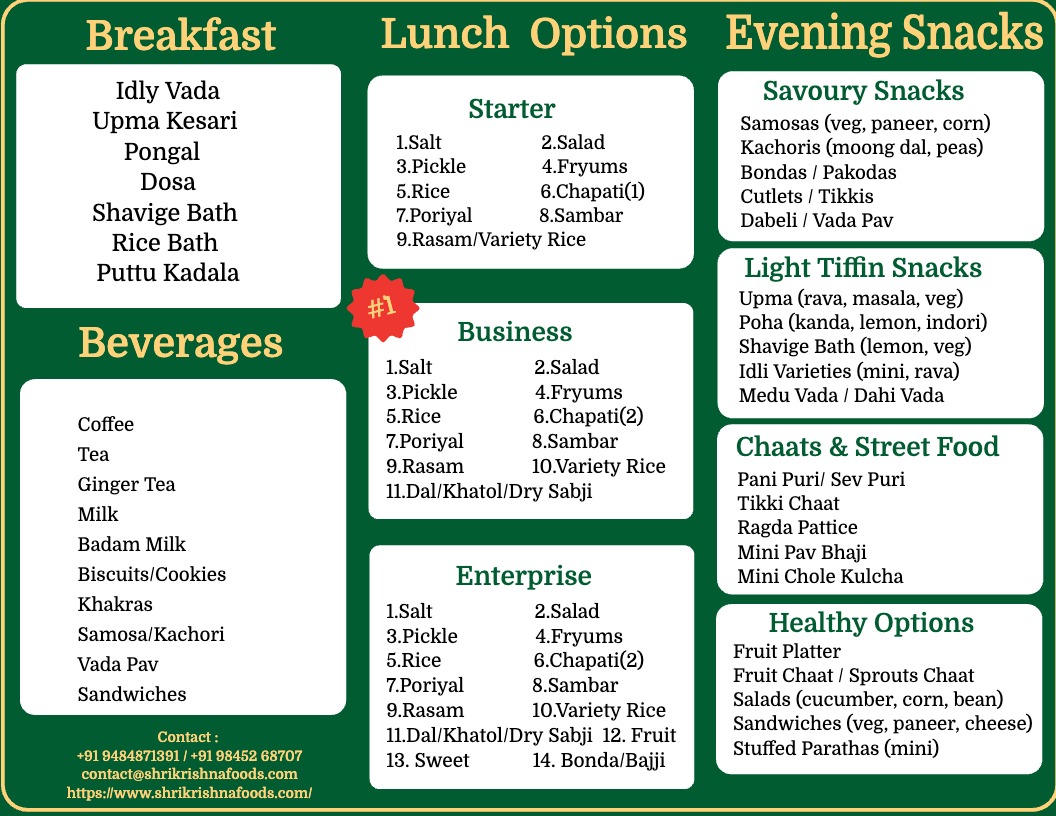 We bring to you the best of Indian Food. From the great South Indian Banana Leaf Meal to a typical North Indian Thali to Satvik Meals.